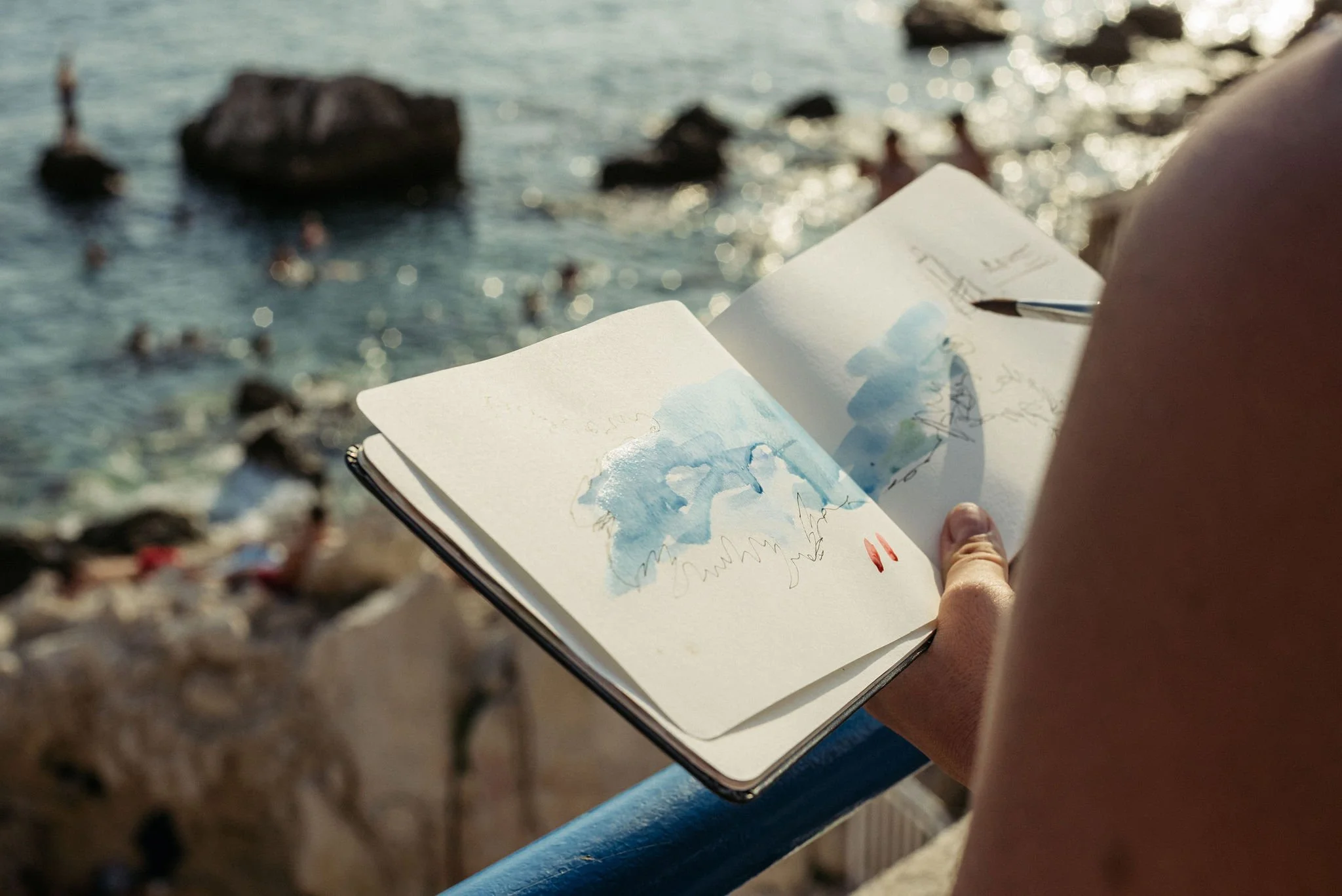 Person sitting outdoors by the water, holding an open sketchbook with watercolor paintings, with rocks and swimming people in the background.